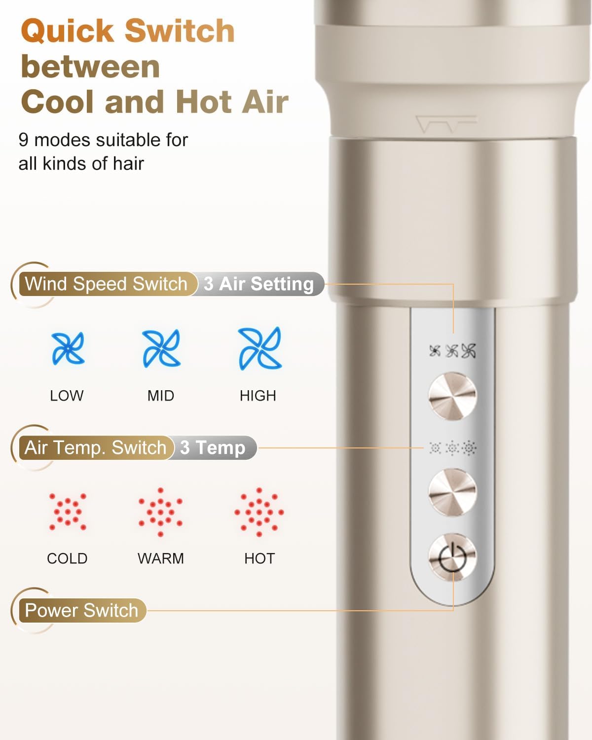 - SAFETY FIRST – We prioritize safety with an NTC feedback system, a bi-metal thermal switch, and an irreversible fuse. The hot air brush offers a quick cooling function by double-clicking the temperature button. Comes with heat-insulating gloves in case of burns. The air styler for hair curling with an Ergonomic button design, concentrated on the upper part of the body, prevents accidental clicks, also we added an ALCI plug to this hair-drying brush.